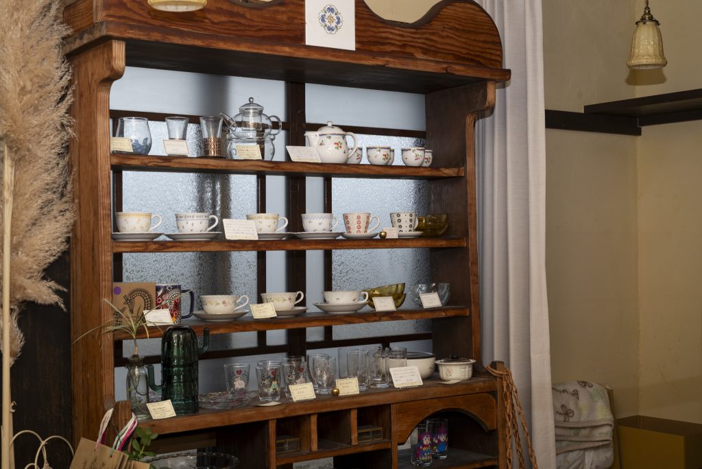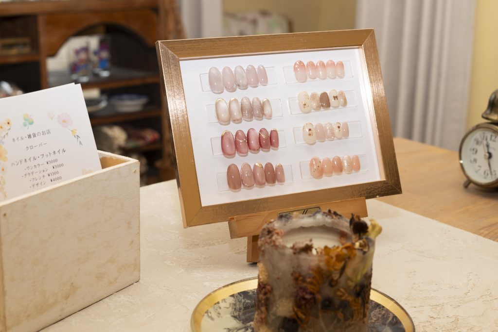 静佳さんがカフェの奥の間で手掛ける「クローバー」は、ネイルが市場よりもかなりリーズナブル。口コミで人気が広がり、今ではリピーターが増加中。店主のセンスで選ばれた雑貨や静佳さんの手によるハンドメイドアクセサリーも並びます。