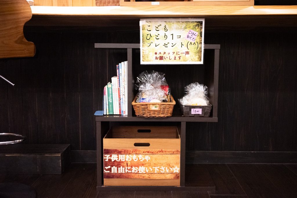 さらに、お子さま連れに優しいサービスも充実。来店したお子さまには、お菓子のプレゼントや、絵本・おもちゃの貸出し、こども用椅子の用意もあるので食事の時間も飽きずに過ごせます。また、ブランケットの用意もあるので、冷えが気になる女性や高齢の方にも安心。