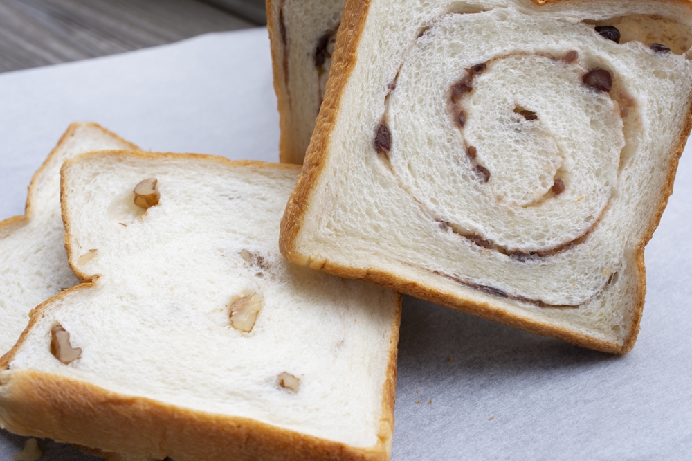 プレーンのほか、くるみ、あんバター、ベーコンチーズ、クリームチーズ(レモン風味)などを練り込んだ食パンは、焼き上がって店頭に並ぶ12時くらいから1時間程度で完売してしまうそうです。