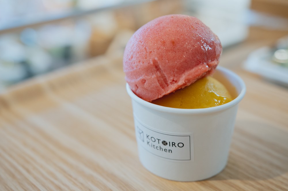 例:もち麦おにぎり150円、スープ150円、サンドイッチ260円、コトデリ(惣菜)180円、コトデリごはん450円など。ジェラートはシングル280円、ダブル350円。