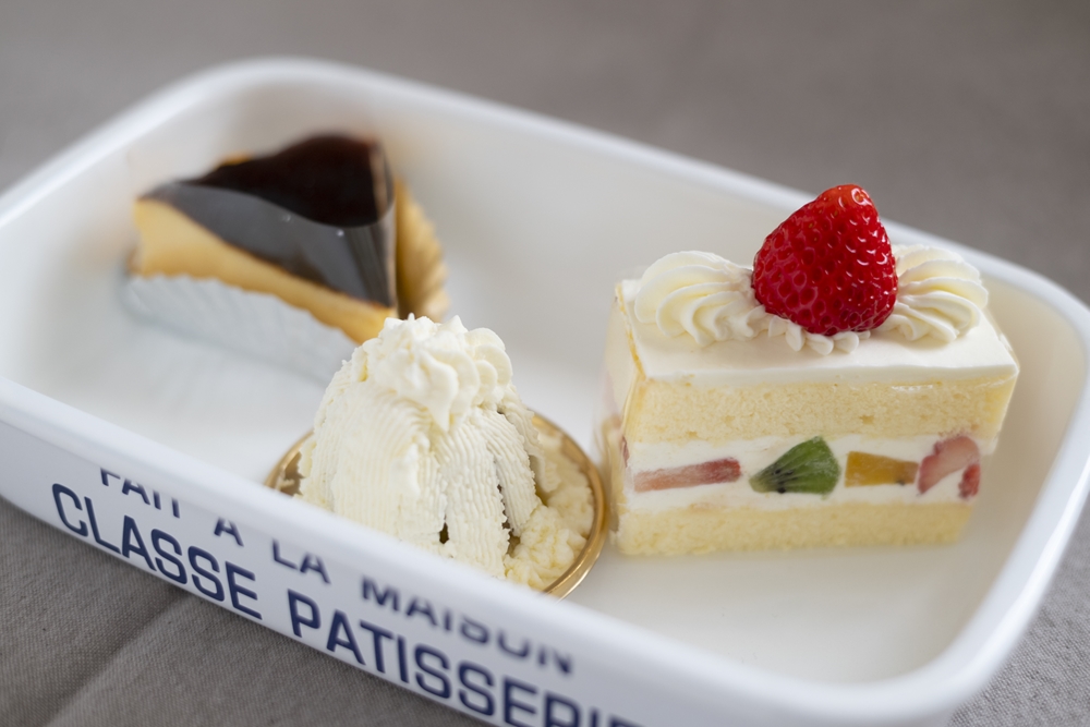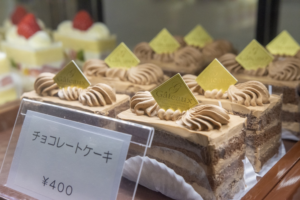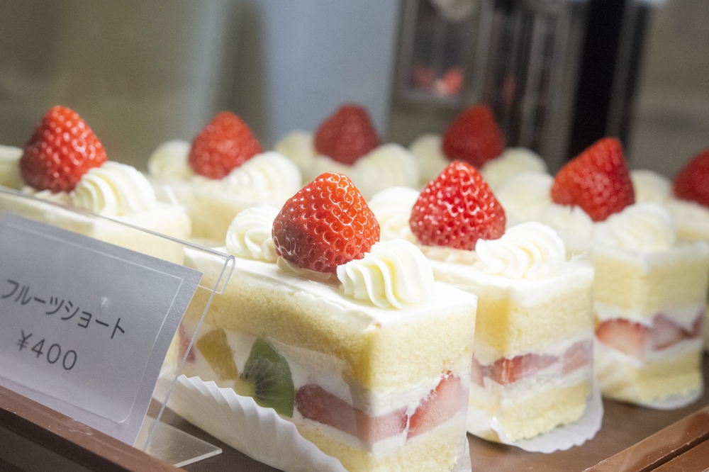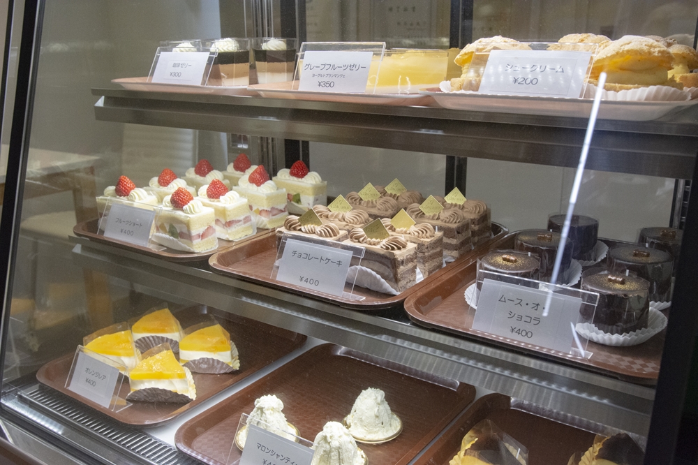 店内に入ってすぐの場所に置かれたショーケースに、この日はショートケーキなどのケーキ類の他、彩りの美しいゼリーやシュークリームなどが並んでいました。